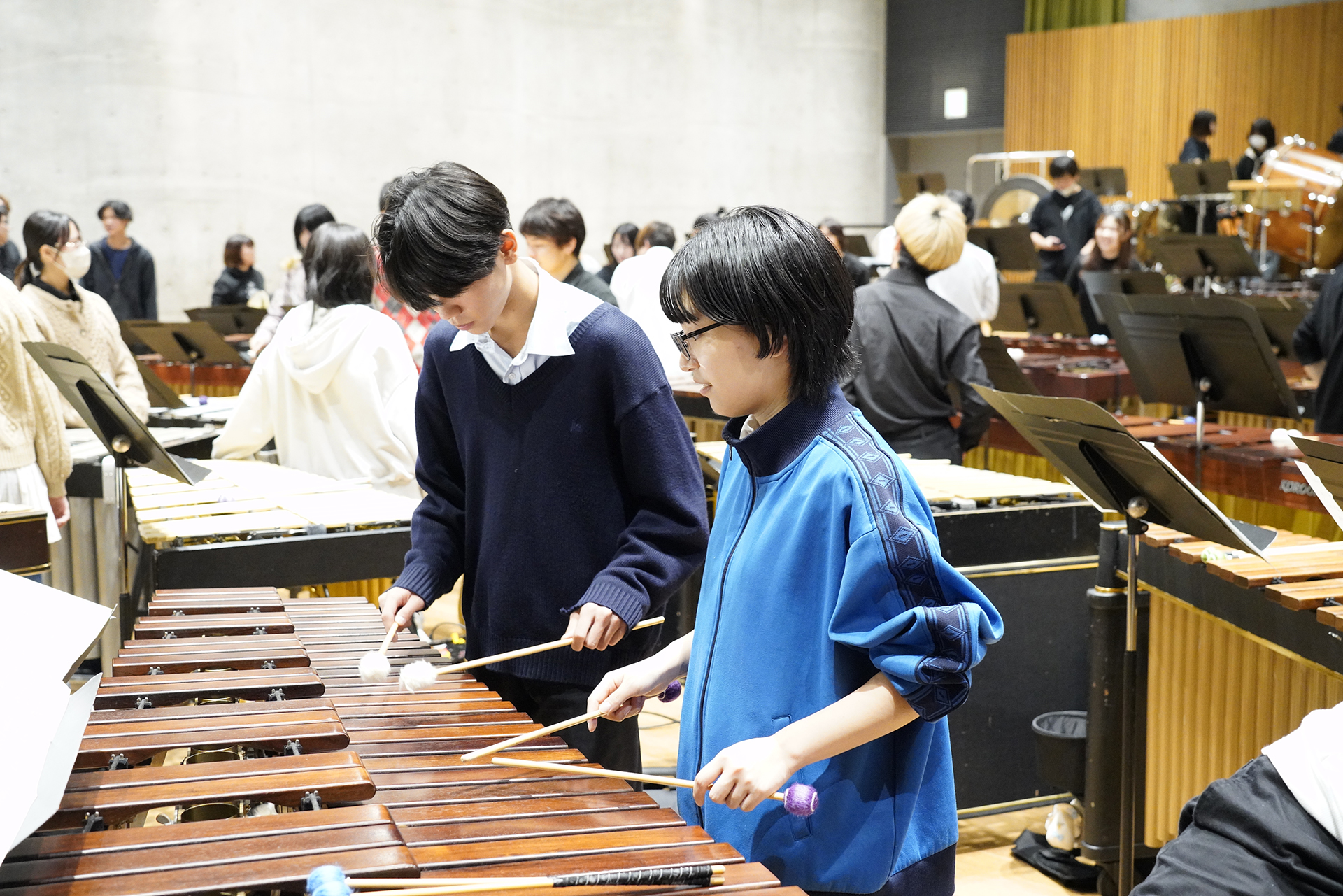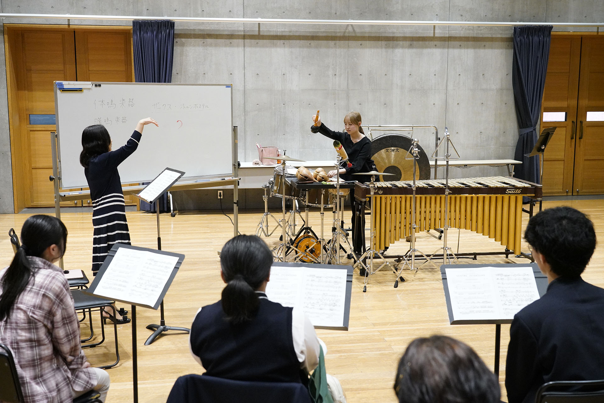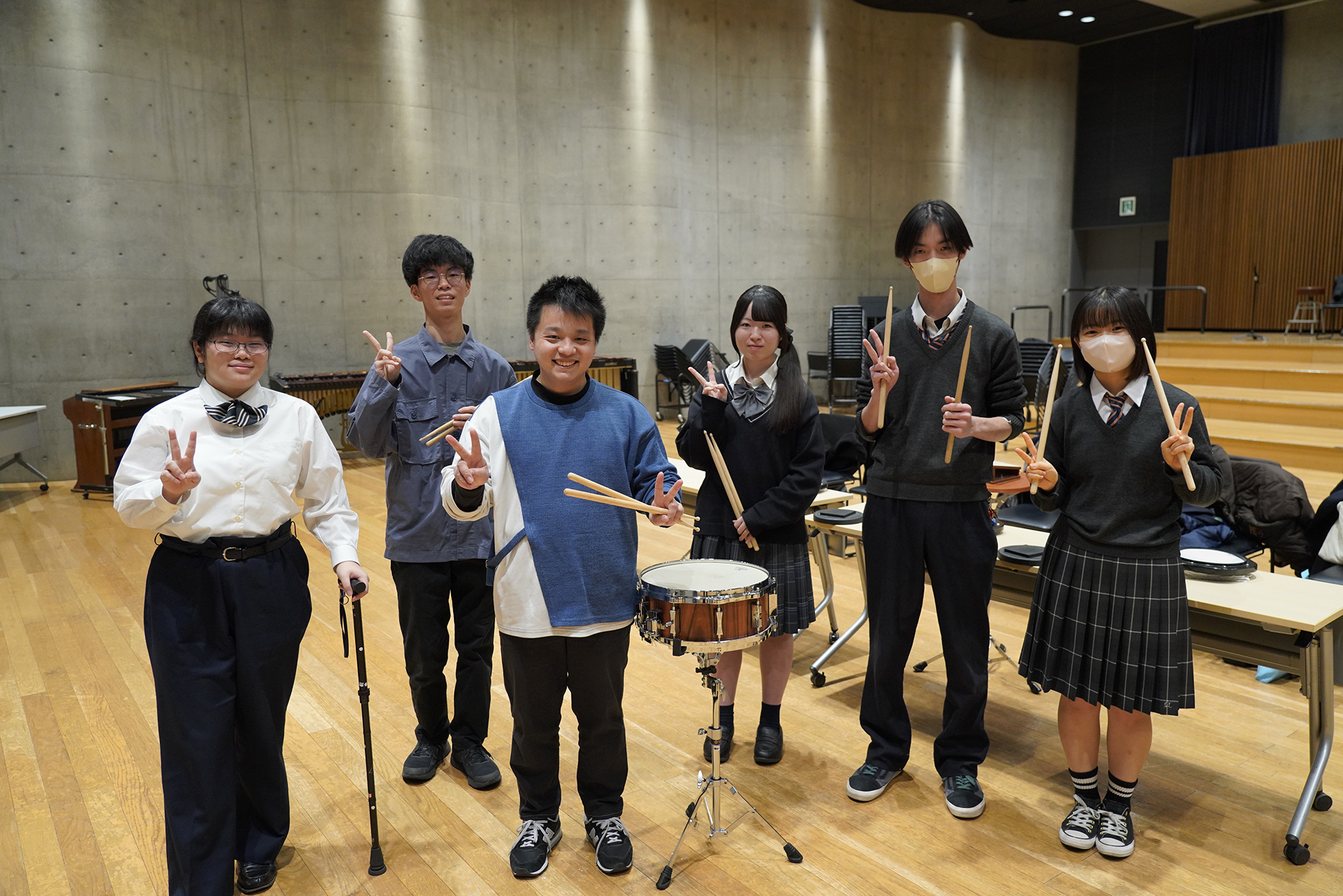 洗足 打楽器コースのテーマソング「UKOZNES(ウコズネス)」の演奏を目の前で聞いて、ここでしか経験できない、打楽器オーケストラの様々な音色を奏でる楽しさを、高校生の皆さんに体験していただきました!