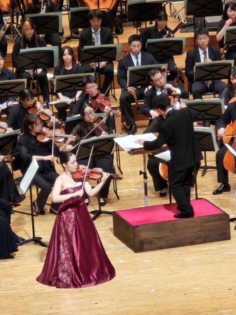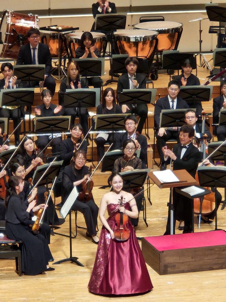 9月27日(土)に大学院室内管弦楽団の定期演奏会が行われ、各コースから選抜された6人が協奏曲を演奏しました。弦楽器コースからは大学院1年生のマノユ瑠南がブルッフのヴァイオリン協奏曲を演奏し、会場から大きな拍手を受けていました。演奏は集中力のある、情熱的な演奏でブルッフの持つ情感を素晴らしく表現していました。 オーケストラを担当していた大学院生たちも、難曲の多いプログラムをしっかりと演奏し、ソリストたちをよくサポートしていました。